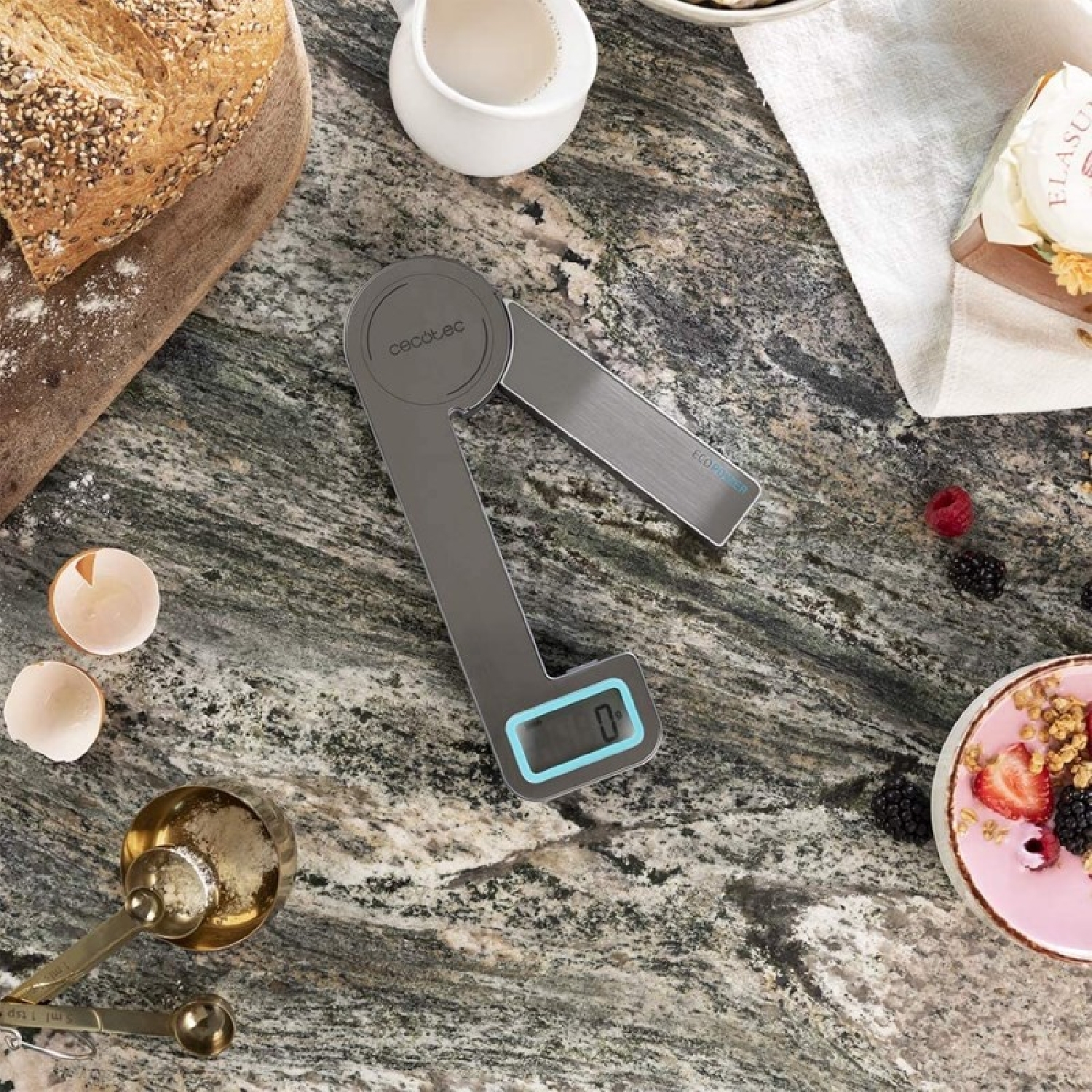 Bilancia da cucina senza pile, pieghevole e con rifiniture in acciaio inox.