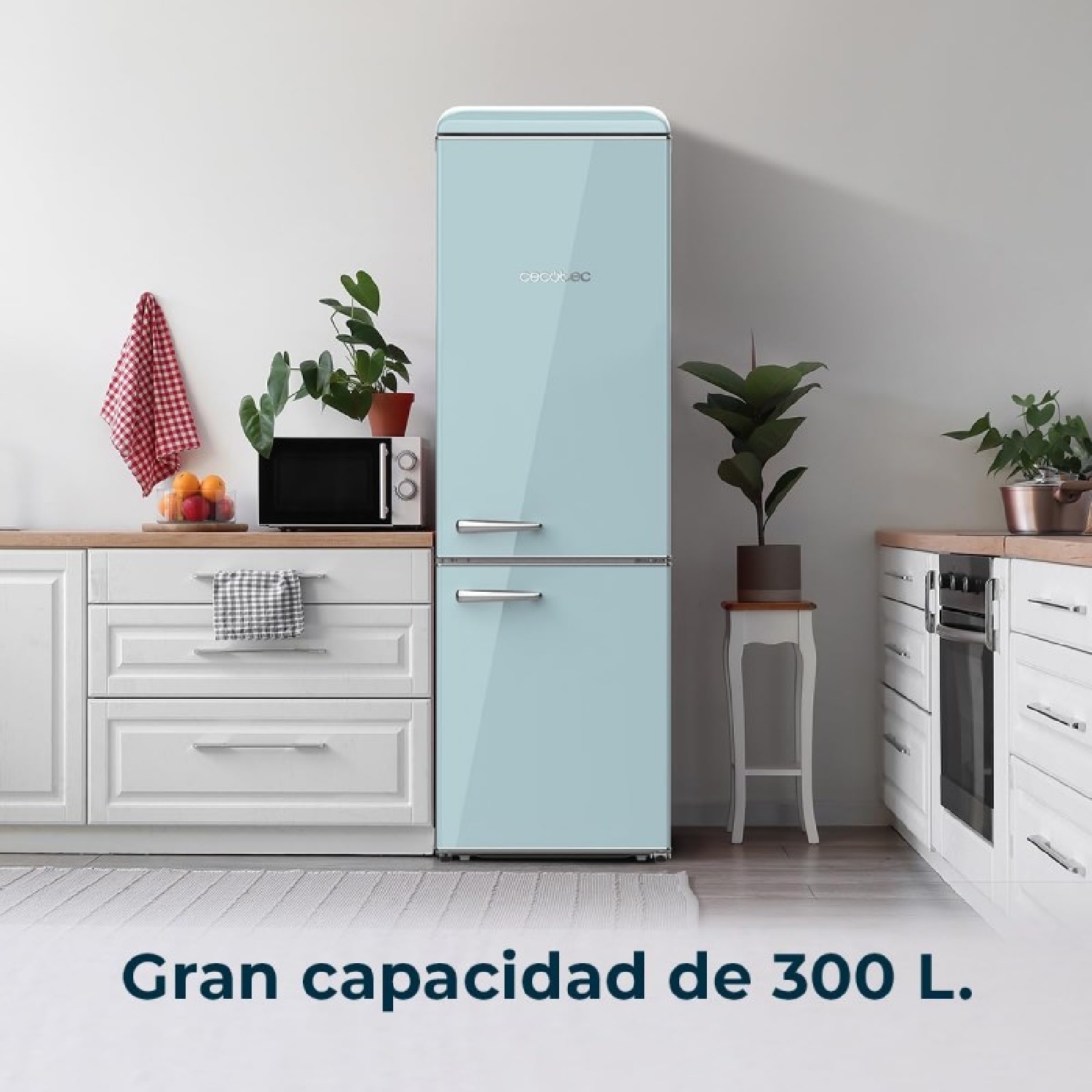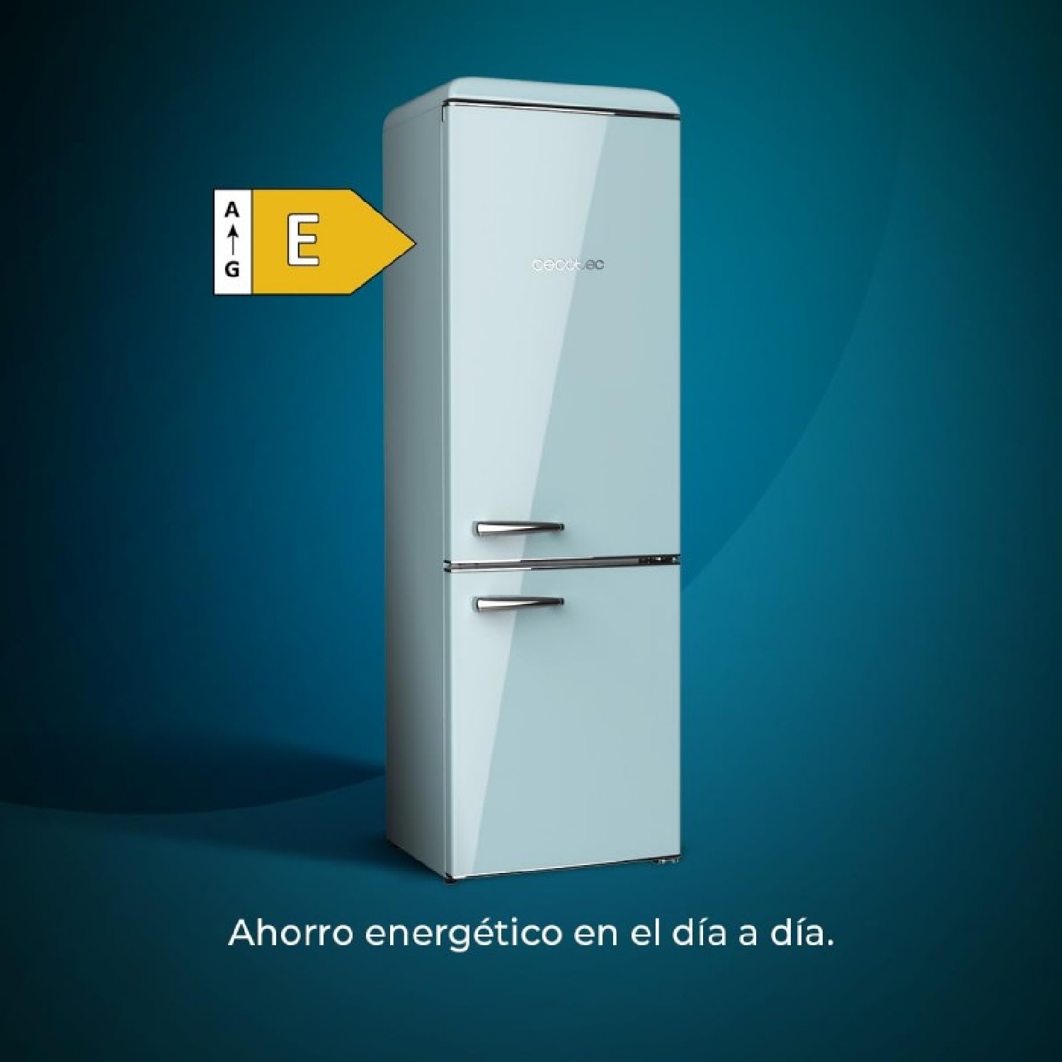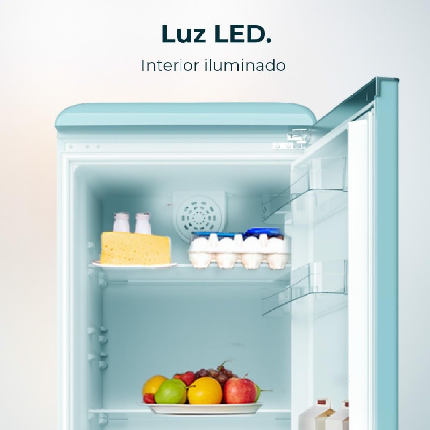 Frigorifero retrò combinato Origin Blue con capacità di 300 litri, classe E, illuminazione interna, ripiani in vetro.