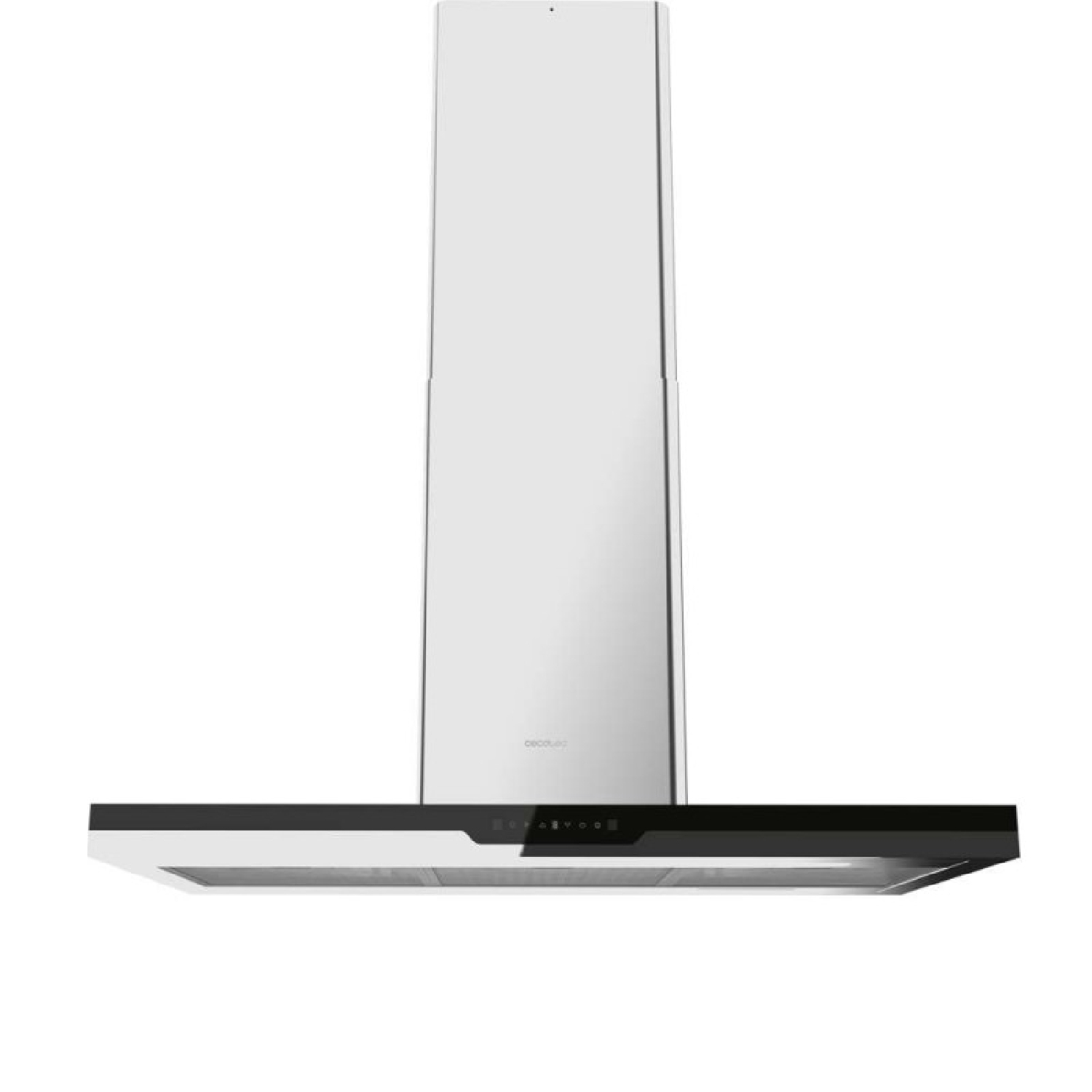 Cappa a isola Bolero Flux ICT 908000 Glass Black A++ larga 90 cm, finitura frontale in vetro nero con effetto specchio, camino inox, potenza di aspirazione di 800 m3/h, motore da 210 W, classe A++, controllo touch, 3 livelli di potenza, luce, filtro a carbone attivo, Hand Movement Control e Delay Function.