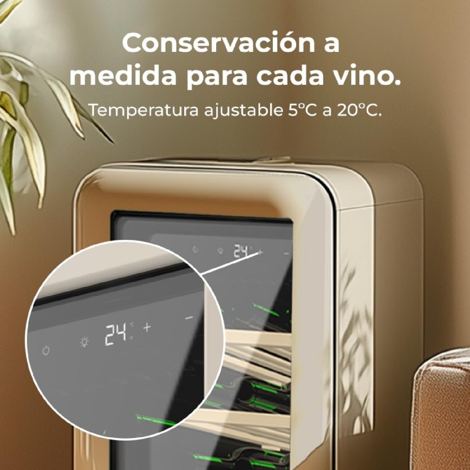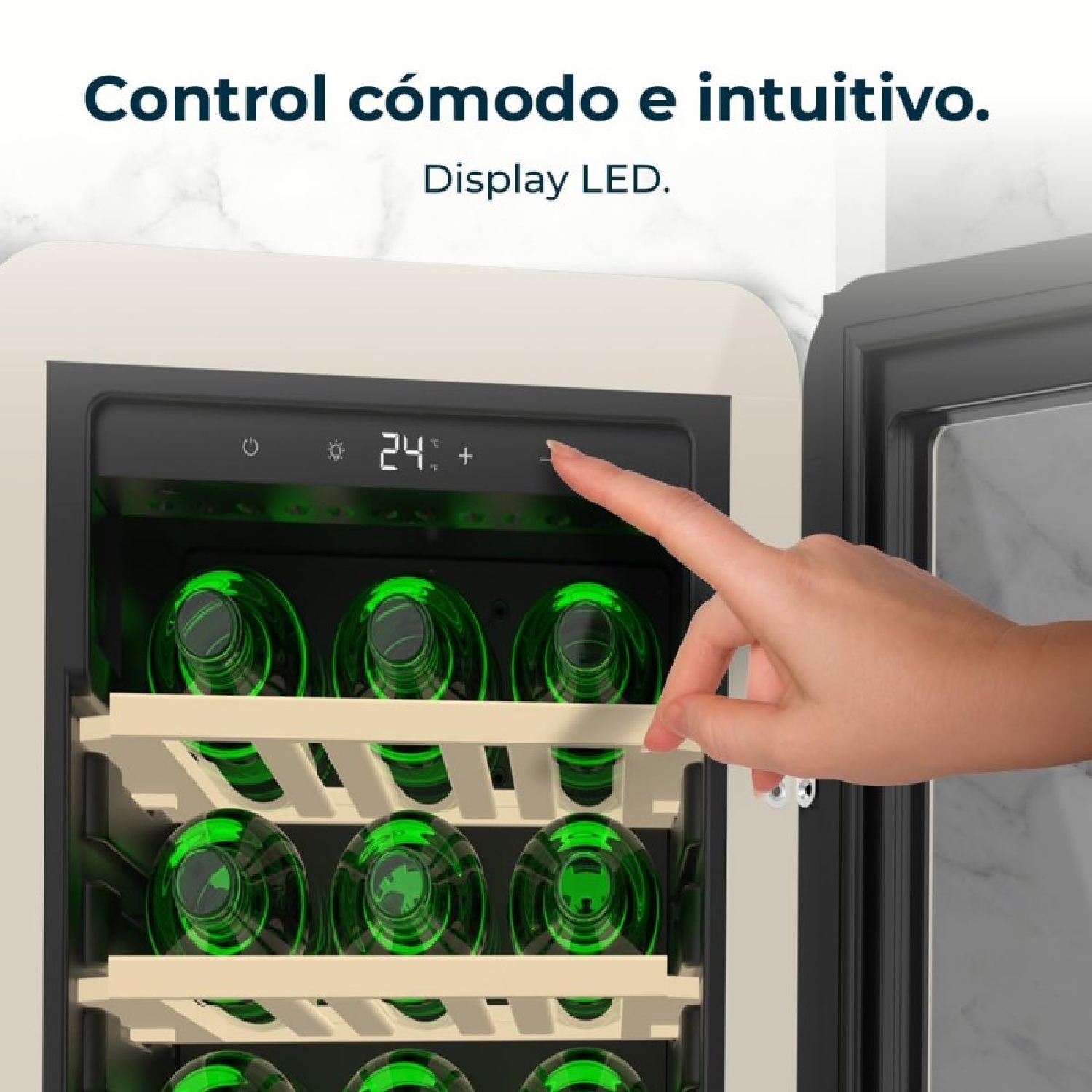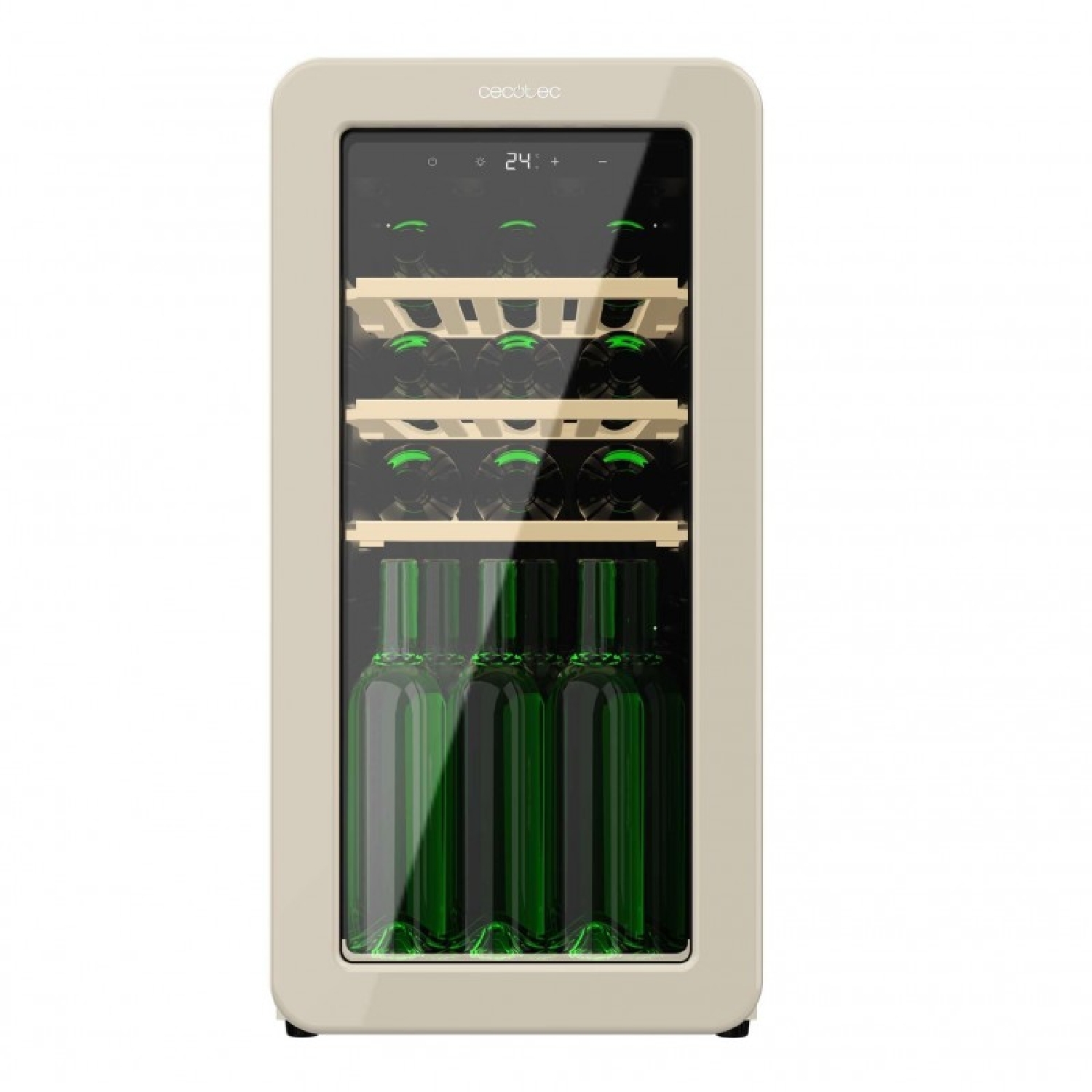 Frigorifero per vino dal design retrò di colore beige, Capacità per 18 bottiglie, Controllo elettronico della temperatura tramite display a LED, Range regolabile da 5 a 20ºC, Compressore Integrato, Tecnologia NoFrost, Ripiani in legno, Luce interna, Ventilazione interna assistita, Dimensioni di H 74,3 cm, L 36,6 cm, P 47,6 cm