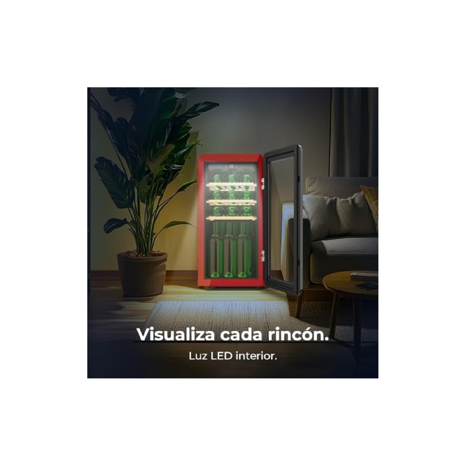 Frigorifero per vino dal design retrò di colore beige, Capacità per 18 bottiglie, Controllo elettronico della temperatura tramite display a LED, Range regolabile da 5 a 20ºC, Compressore Integrato, Tecnologia NoFrost, Ripiani in legno, Luce interna, Ventilazione interna assistita, Dimensioni di H 74,3 cm, L 36,6 cm, P 47,6 cm
