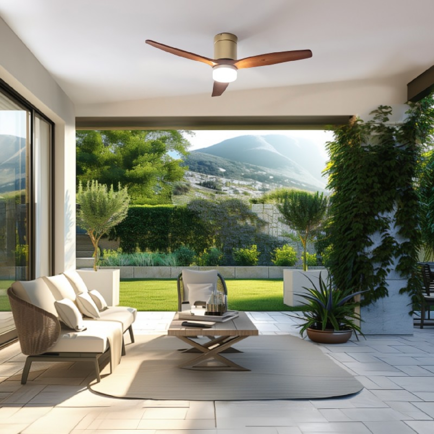 Ventilatore da soffitto da 40 W e 52″ con telecomando, Wi-Fi e telecomando, protezione IP44, 6 velocità, 3 pale, modalità winter-summer e timer fino a 8 ore.