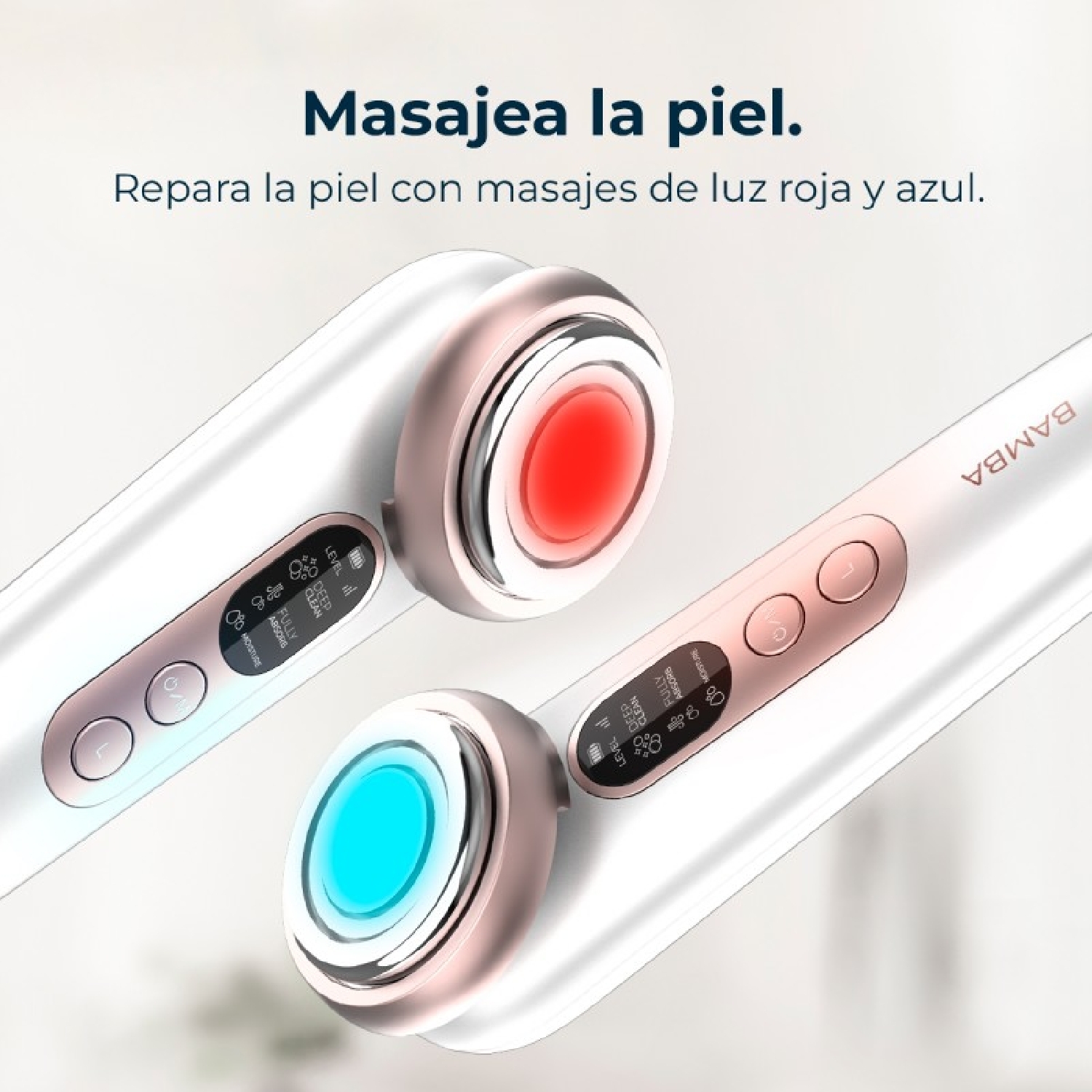 Massaggiatore per viso con fototerapia a luce blu e rossa, funzione di riscaldamento, vibrazione e microcorrente EMS. Display e funzionamento a batteria.
