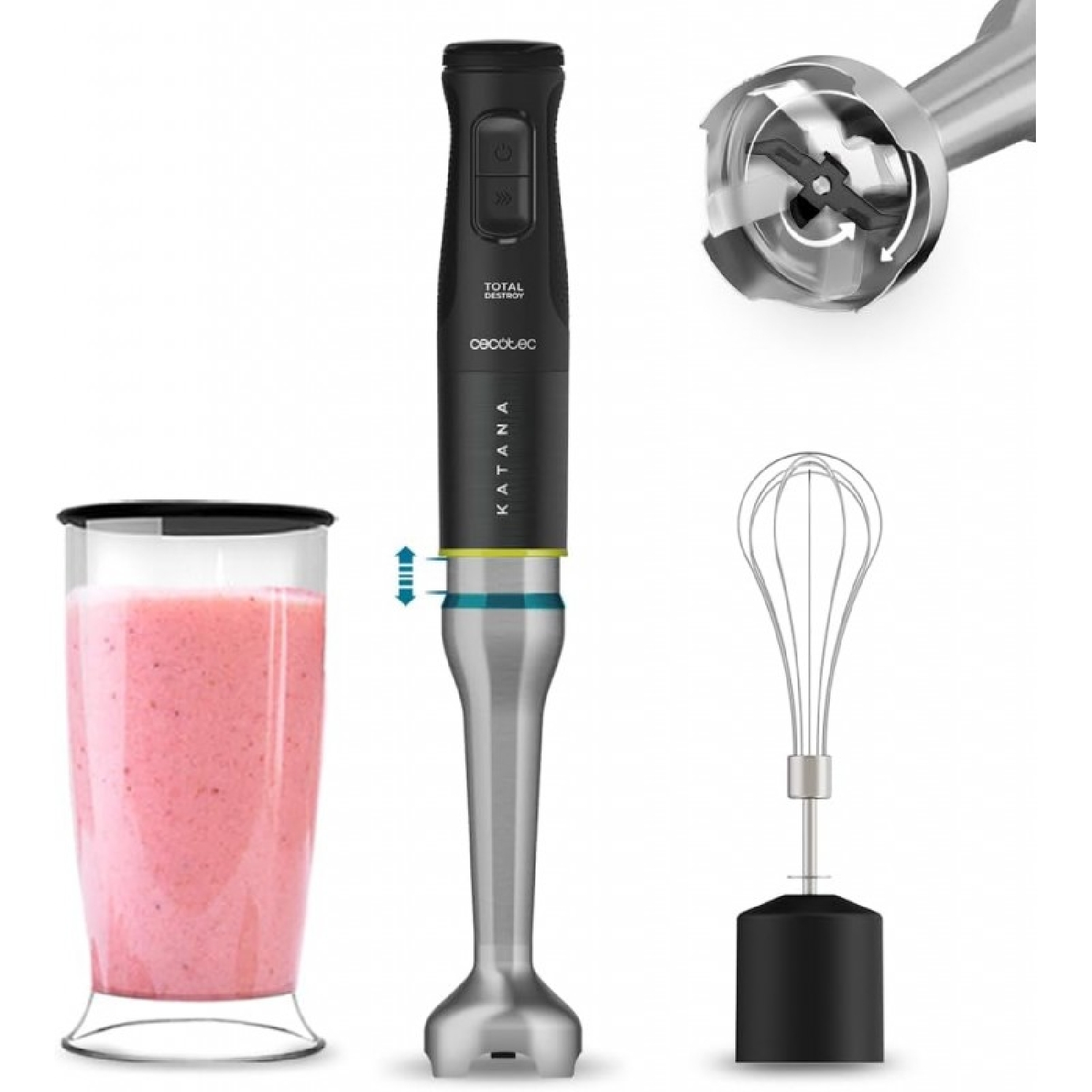 Frullatore a immersione da 1500 W di potenza massima con display digitale, tecnologia TotalDestroy con 4 lame nere in titanio con effetto forbice e sistema PerreoMove che muove le lame verso l’alto e verso il basso per frullare di più con meno sforzo. Include un recipiente da 800 ml con coperchio e fruste.