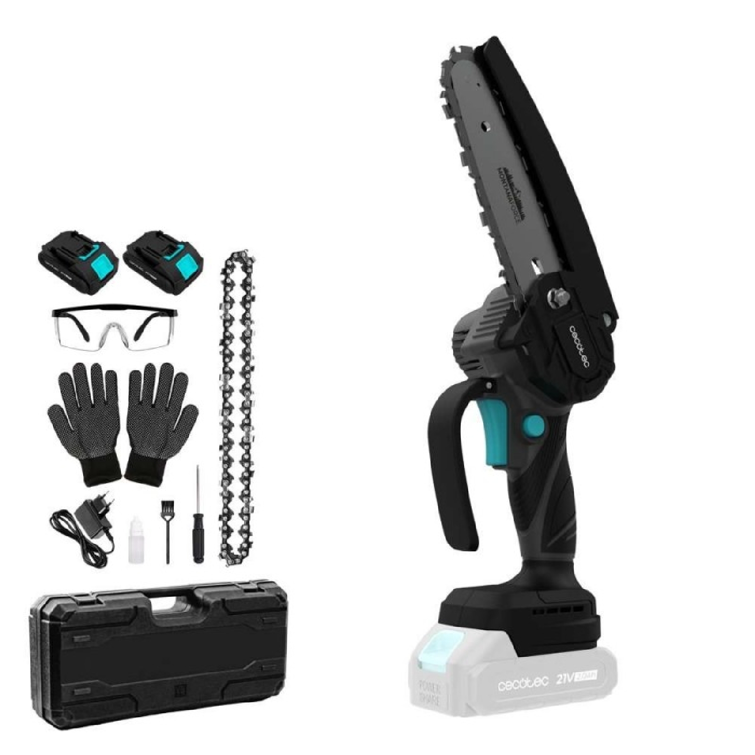 Sega per potatura da 6″. Motore brushless, senza spazzole. Batteria 21 V. Ingrassatore a pulsante. Include valigetta, catena extra e set di accessori.