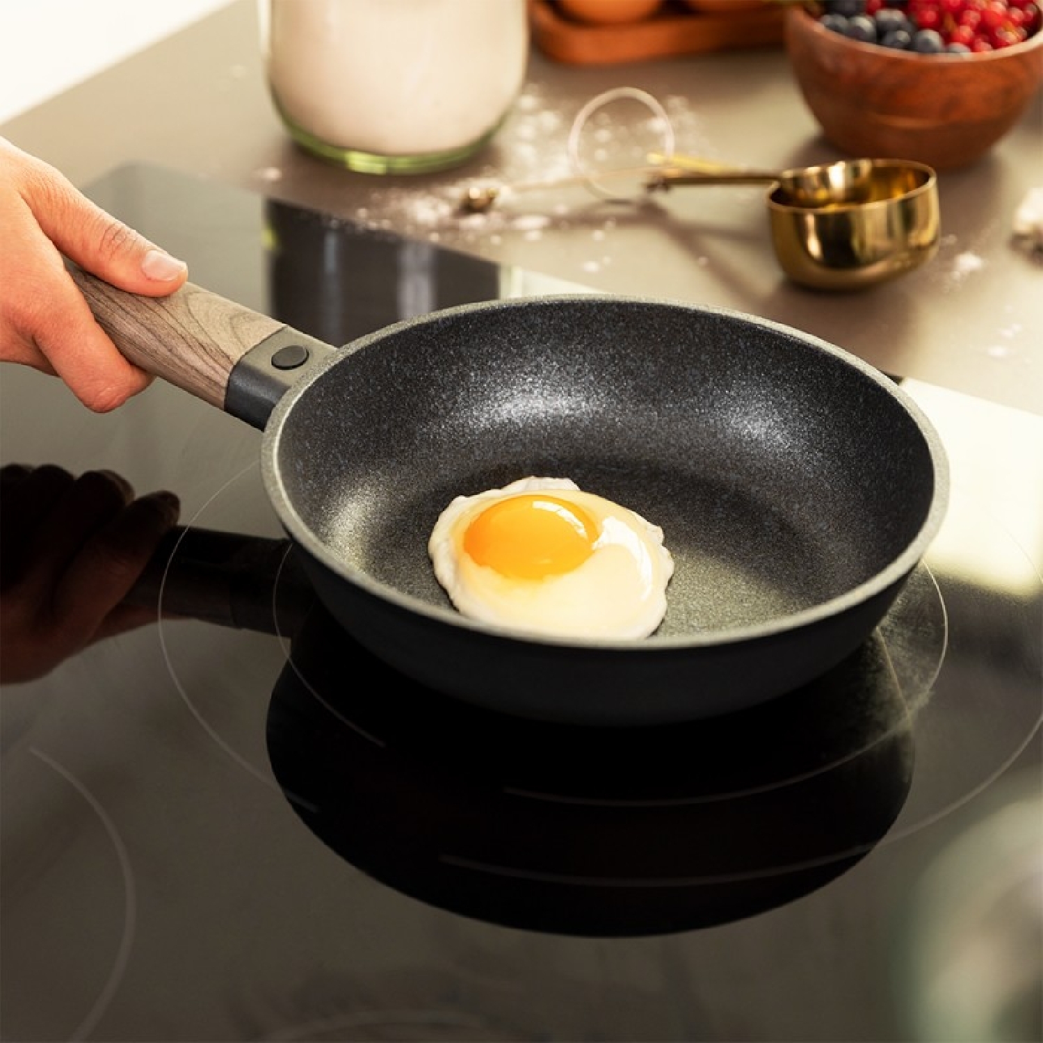 Set di padelle da 18-22-26 cm in alluminio fuso di alta qualità, con 6 strati e massimo rivestimento antiaderente Teflon™ Nonstick Coating, senza PFOA, con fondo diffusore di calore Full Induction, lavabile in lavastoviglie e adatto a tutti i tipi di fornelli, compresi quelli a induzione.