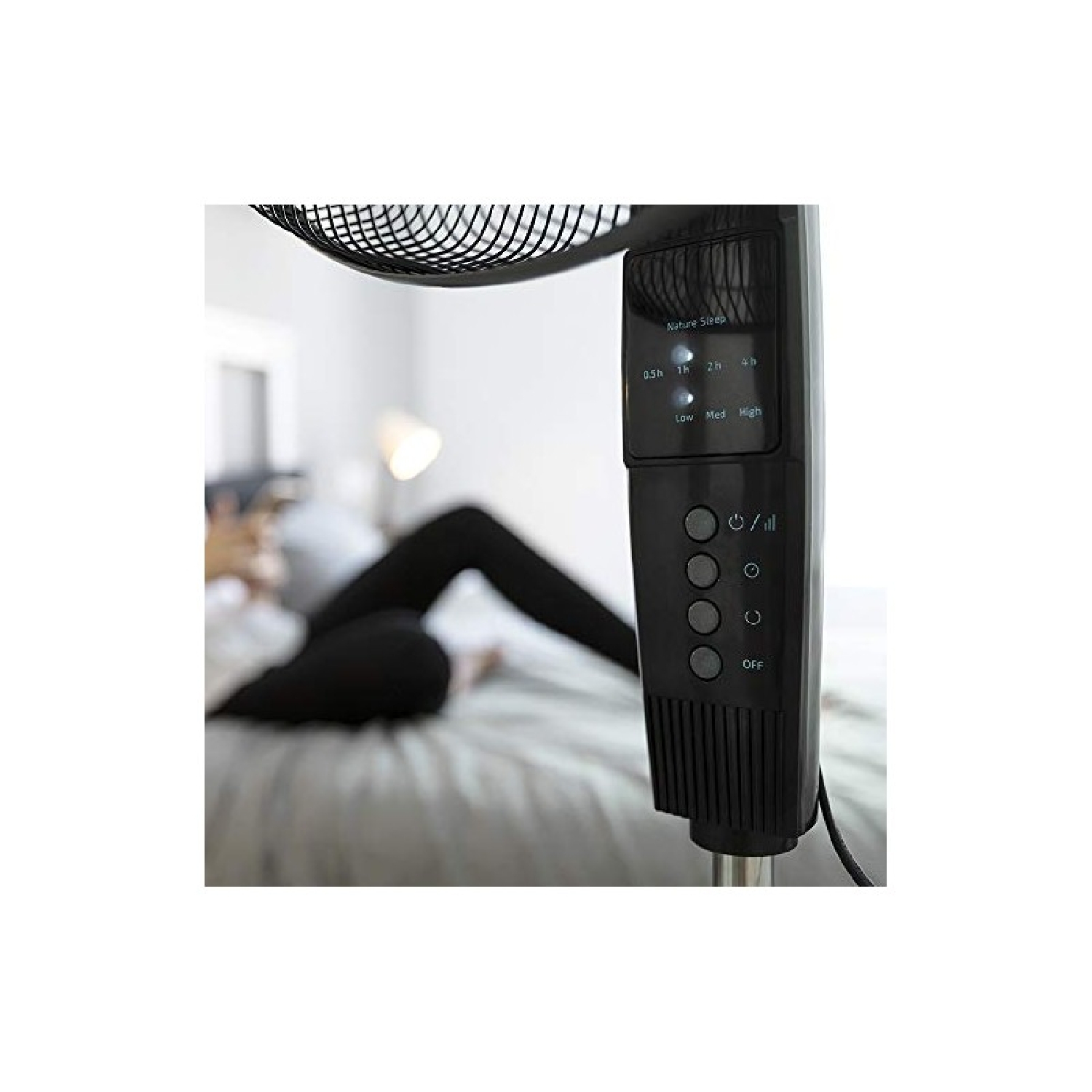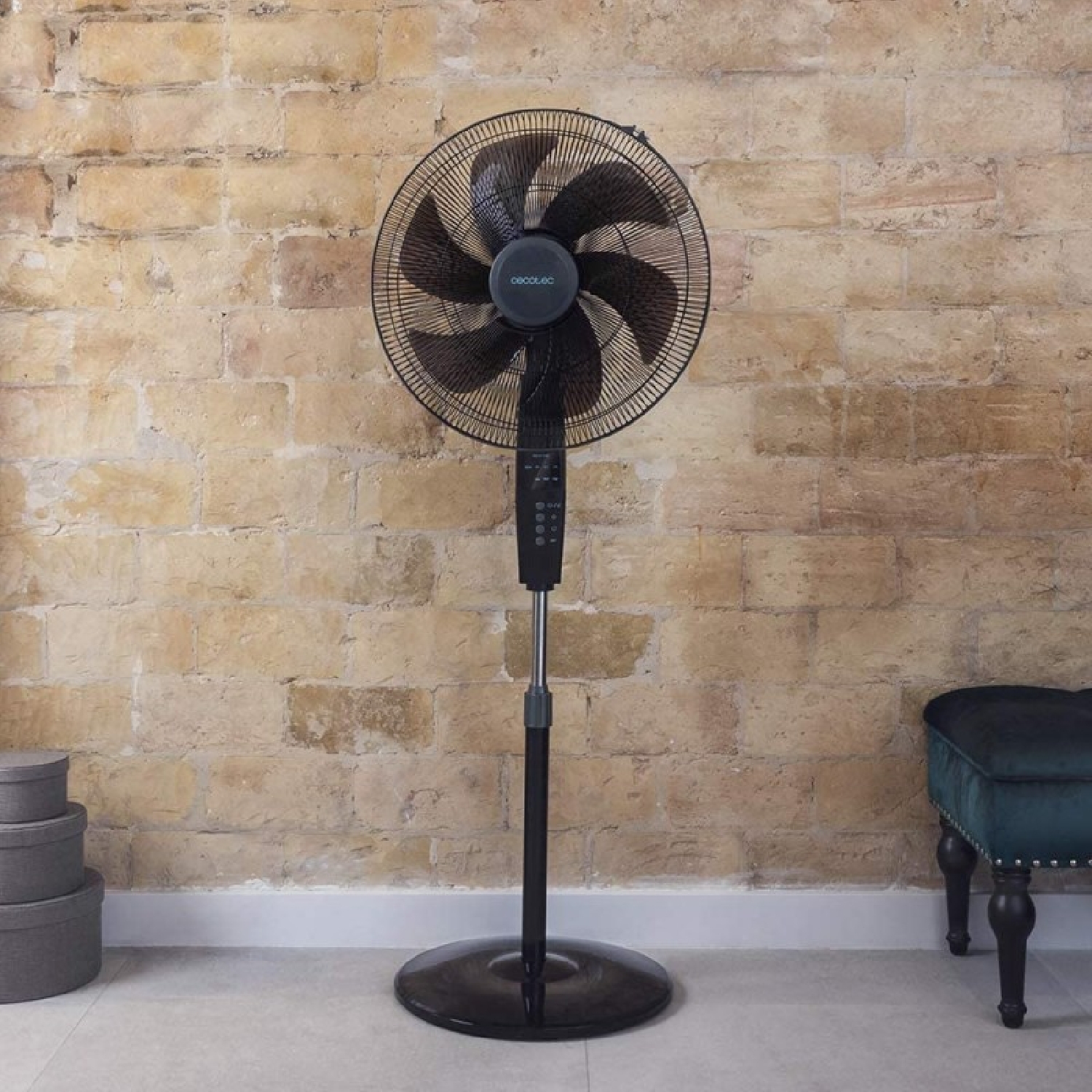 Ventilatore a piantana da 18 pollici (45 cm) e 6 pale, con motore in rame e 3 velocità. Oscillazione a 75º e altezza regolabile di 20 cm. Timer, telecomando e luce LED che indica la funzione. Grande stabilità.