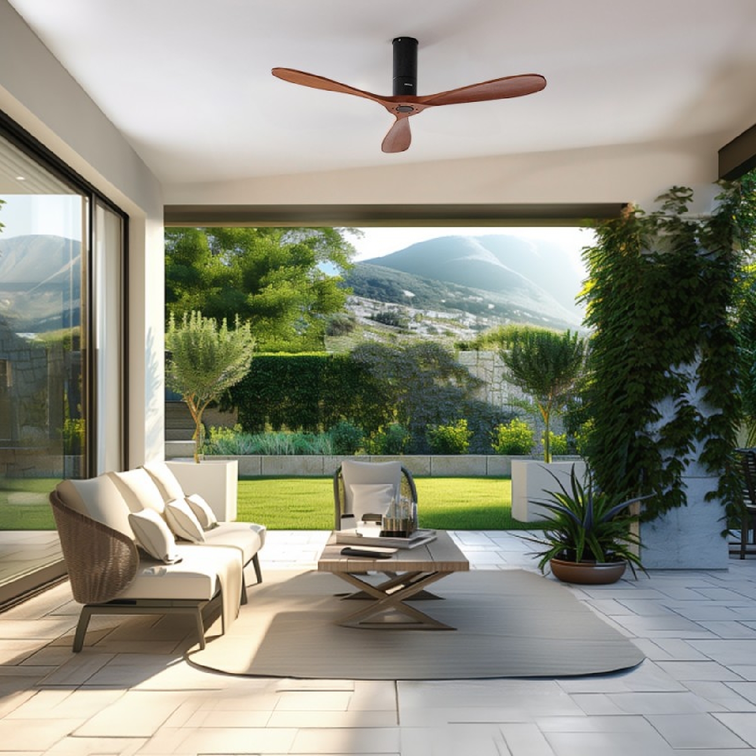 Ventilatore da soffitto da 40 W 52″ con telecomando, Wi-Fi e telecomando, protezione IP44, 6 velocità, 3 pale, modalità winter-summer e timer fino a 8 ore.